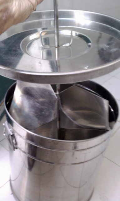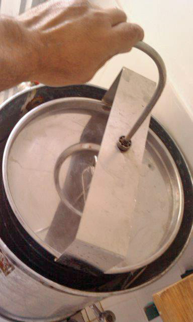 I always got upset with spinning the curds with a wooden ladle. So I worked on an idea- I took a steel rod, inserted it in the middle of the steel bowl’s lid, fixed the inner part with steel blades and placed it through a bearing for easy rotation. This I did with the help of a fabricator.