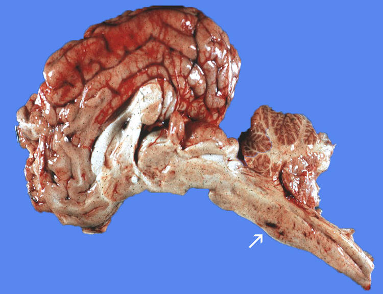 | This shows the brain stem and where a goat was attacked by Listeria bacteria. You can see the lesions caused by it. |