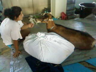 I am going to give you a list of which herbals we used and their specific use for treatment. Liver and Gall Bladder Extract contains: Barberry or Oregon Grape Root, Wild Yam, Cramp Bark, Fennel Seed, Ginger, Catnip and Peppermint used to “unblock” these organs for better function and speed up the blood purifying process. Kidney Extract contains Juniper berries, Parsley, Uva Ursi, Marshmallow root, Lobelia, Ginger and Golden Seal root. Trtmt for: Bladder Ailments, Bloating (Water Retention), Bruises, Cystitis, Enuresis (incontinence), Fragile Capillaries, Kidneys, Nephrolithiasis (kidney stones), Osteomalacia (like Ricketts), Urinary Calculi, Urinary Tract Infection, Water Retention. Ear & Nerve tincture contains: Blue Cohosh, Black Cohosh, Blue Vervain, Skullcap and Valerian. A formula specific to the motor nerves, greatly beneficial to the whole nervous system, helping to rebuild the nerves and nervous system, has also been used historically for the health and vitality of the spinal cord and other nerves. Bidens liquid (an herbal antibiotic), this is Christine’s recipe made from a local herb, Bidens pilosa or Bidens alba, that targets any infection in the whole body. Rosemary Essential Oil (w/olive oil), is used as an Analgesic, antiarthritic, antibacterial, antidepressant, antioxidant, antirheumatic, antiseptic, antispasmodic, astringent, carminative (promote healthy action of the stomach wall & intestines and expel gas), cholagogue (acts on the liver & increase secretion of bile), decongestant, diaphoretic (promotes perspiration), digestive, diuretic (produce a copious excretion of urine), expectorant, fungicidal, hepatic (helps with liver function), hypertensive, nervine, restorative, rubefacient (causing dilation of the capillaries and an increase in blood circulation), stimulant, stomachic, sudorific (makes you sweat), tonic, vermifuge (antiparasitic), vulnerary (useful in healing wounds), specifically in this case for: fainting, headache, hysteria, jaundice, memory loss, mental fatigue, migraine, muscle aches and pains, nervous disorders, neuralgia (pain in one or more nerves caused by a change in neurological structure or function), rheumatism, slow circulation, sore muscles. Ginger/Rosemary Leaf Tea, aids in the improvement of nerve function as explained previously with rosemary essential oil (this oil should NEVER be taken internally), with the ginger helping absorption by the brain of the rosemary leaf tea. Iron herbal formula, this is Christine’s formula, contains Yellow Dock Root, Dandelion leaf and root, Superfood mix, Beet Root, and Burdock Root all used to help support liver function and rebuild iron in the blood. Garlic Immune System formula, also Christine’s formula, provides an “all-over” immune system boost to fight all infection. Probios in the form of water kefir and goat probios powder. Herbal Tummy Tamer, another formula from Christine, for use after you worm your goat to sooth the lesions and damage done by the worms. It contains: Ginger, Clove, Marshmallow Root, Slippery Elm, Cinnamon, Cayenne pepper, Raspberry Leaf