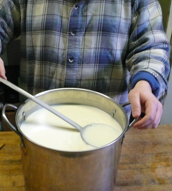 When the temperature reaches 135°F add 1/2 pint whole milk and stir. (We add the milk because more ricotta will come out.)