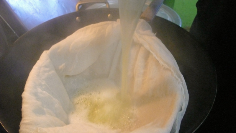 Drain the whey into a pot and keep it. (Because you will need that whey for cooking the Hellim.)