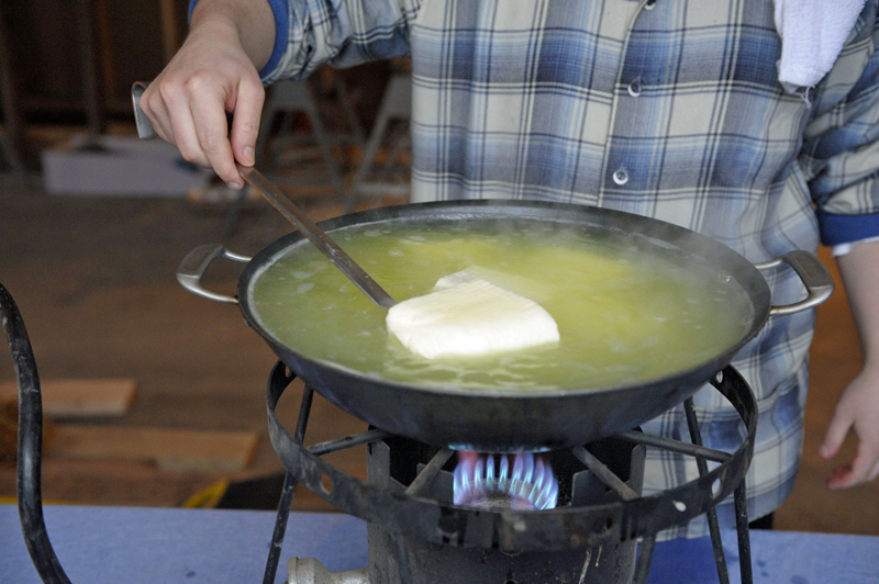 Bring the whey temperature to boiling. When it starts boiling, put the cheese blocks inside the hot whey slowly.