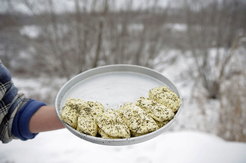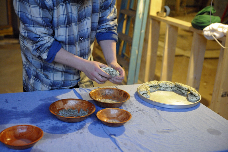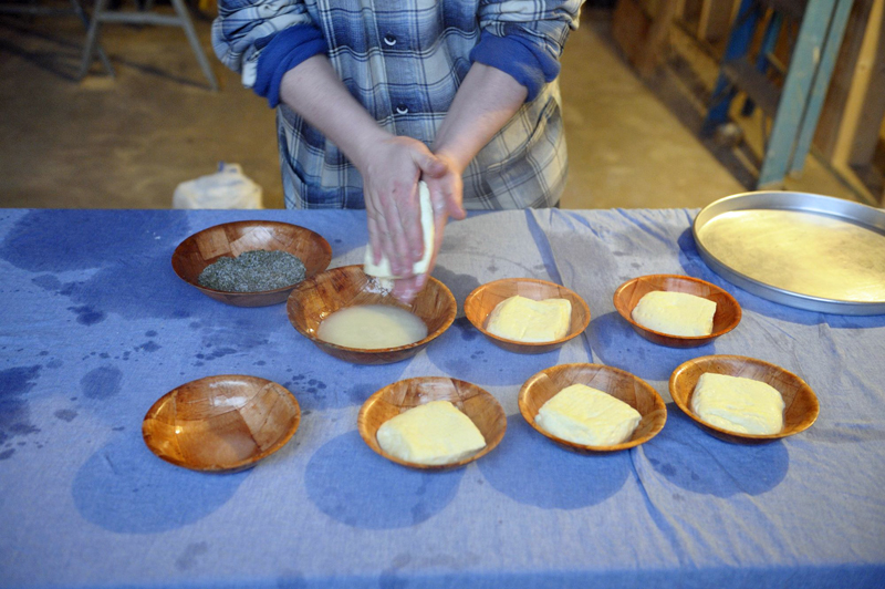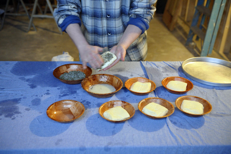 When the blocks have cooled, take each one, press it a little with your hands, and rub on the mint/salt mix. Then fold the block in half and rub more mix on the outside of it.