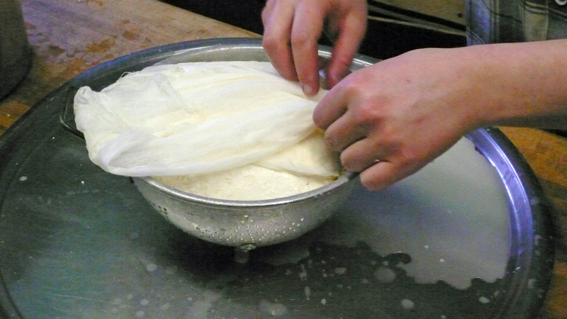 Take all the curds and transfer into colander lined with cheesecloth.