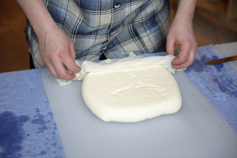 After 2 hours remove the cheese from the press and gently peel away the cheesecloth.