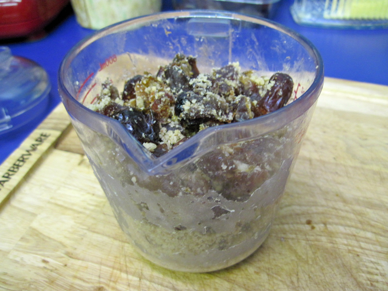 | I had already ground some walnuts so I added them to the dates in the food processor (it’s easier to process the dates when there are nuts in with them) |