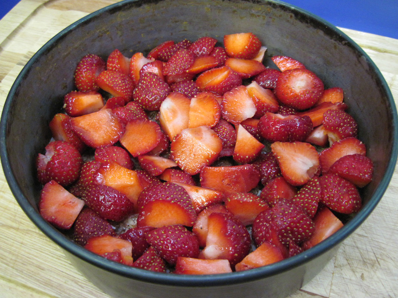 | The second time I added fresh strawberries (from Upinngil Farm) between the crust and the filling. |