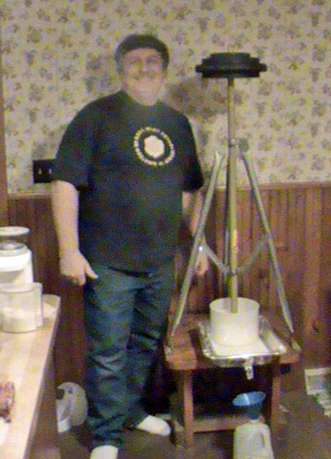The important thing is that it works and I now have a large cheese wheel drying in the kitchen. But my wife won’t let me keep this marvel of creative engineering in the kitchen. So I now have to lug my press, which amounts to a piece of furniture, back and forth between the cellar and kitchen. I have included a picture of it with the “genius” who built it standing next to it. Not only has cheese making changed my life but also that of my poor wife. I’m glad she is a good sport.