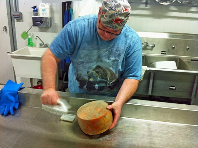 Ian Treuer brushing the mold off a wheel of cheese |
