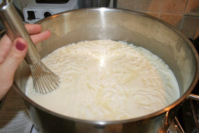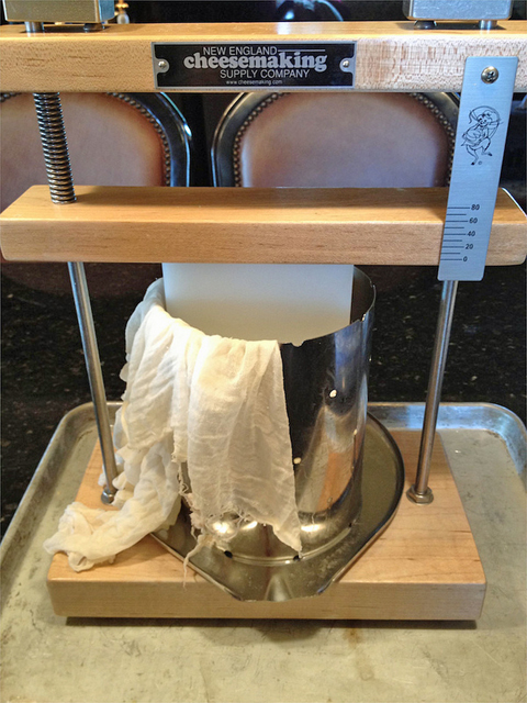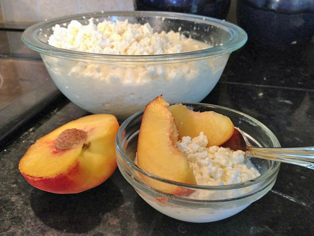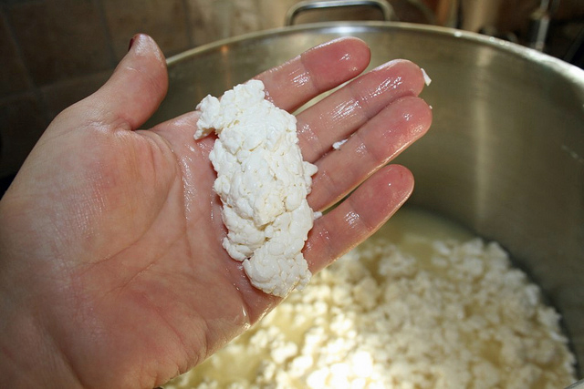 We milk one cow, Faith, and keep all her milk. One of our other Jersey Momma’s adopted Faiths’ calf. Faith’s part mini-Jersey and gives us just the right amount of milk. We got just over 3 gallons a day when she was new in lactation. We’ve been milking 7 months and now we’re getting almost 2 gallons. I collect two days of milk before making a four gallon pot of cheese. I use yesterday’s milk and today’s fresh milk and then start making cheese!