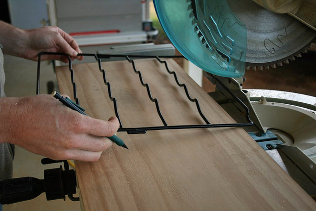 | Andrew cut the pine shelves for the wine fridges. Rashel wonders why the shelves are always narrower toward the back? |