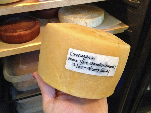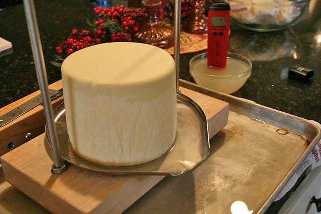 Camembert, Muenster, cloth bound Cheddar, the long cultured version of Mozzarella, Ubirico (Drunken Cow Cheese), Tomme, Parmesan, Gouda, Colby, Monterey Jack, dill Gouda, Gruyere and Swiss (experimental stage) … those are all the ones I currently have in the cave or freezer (as well as fresh Mozzarella curds, ready to stretch).
