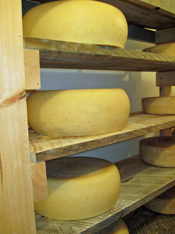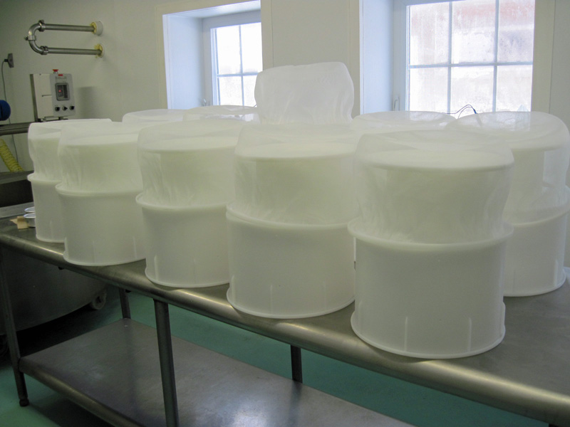 Their vat holds 264 gallons. They bought it new because they couldn’t find one used. That was a major expense. Their Kadova molds were another significant investment. They hold 25 pounds each. (The Swiss cheese does better in big wheels, so they have adapted their other cheeses to fit these molds.) The first day I was there, they were only using 180 gallons of milk because this time of year, their 34 cows are not giving much milk. In the summer months, the cows are milked twice a day and the yield is much greater.