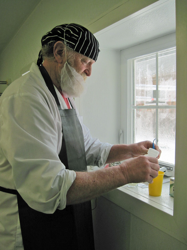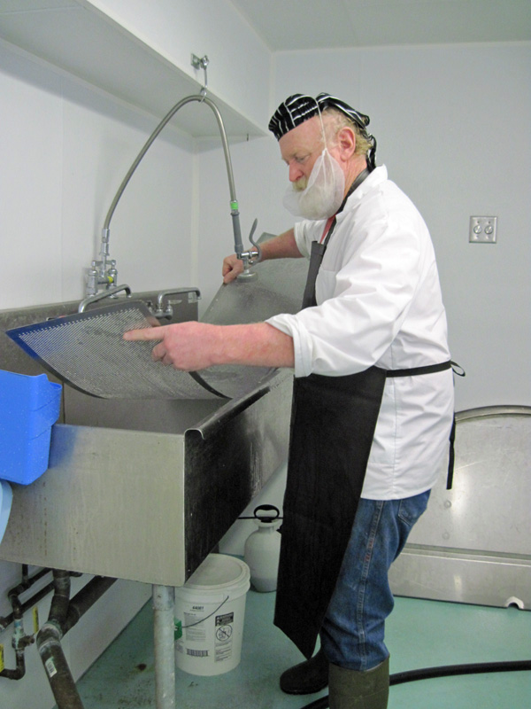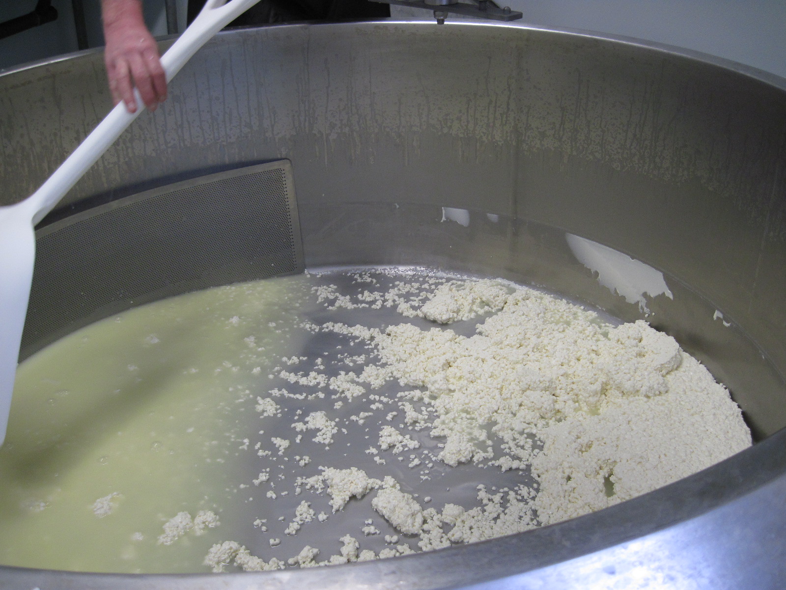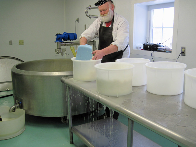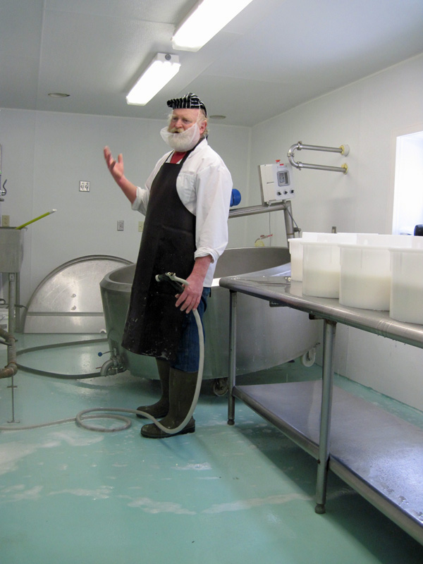When the curds are cut, Ray drains off the whey which gets taken by a neighboring farm for their pigs. As he works, he cleans his equipment.
