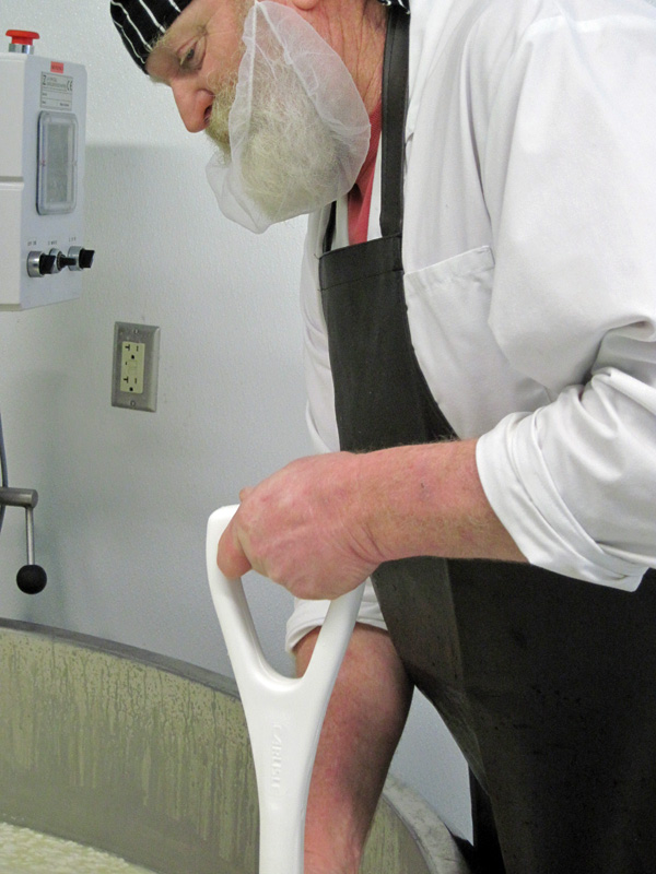 At this point, I had to leave, so I came back again to see the rest of the procedure. On that day, Ray was making a brick cheese with less milk than he had been using in the pictures above. While he was cutting the curds, he carefully cleaned some of the curds off the bottom of the cutters which are sharper than they look.