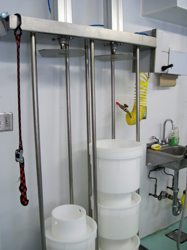 When the molds are full, the followers are placed on top and the curds drain as the cleanup continues.