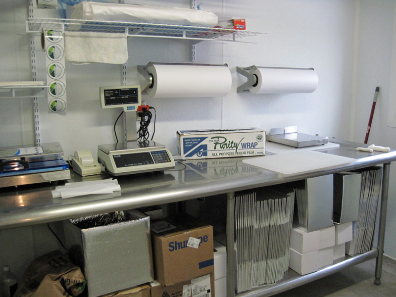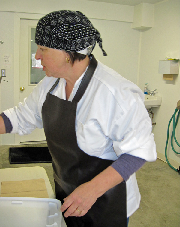 In the pictures below, Pam is shown cutting and packaging the cheese. Most of the time, however, she is busy with marketing, public relations, finances, inventory, employee supervision, the chickens and putting out fires. In other words, she wear lots of different hats!
