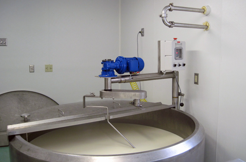 | When filling this vat, milk is pumped from the milking parlor directly to the pipes above. The elbow is removed, another pipe is fitted in and the milk pours directly into the vat. |