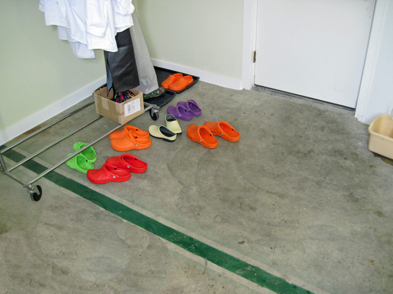 | Shoes, coats and hats are provided for anyone entering the work area. |