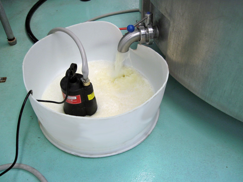 | Whey pours out of the drain holes from the wet curds |
