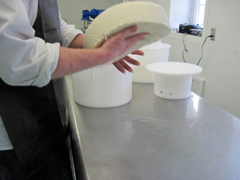 When he is done cleaning the vat (which he does thoroughly inside and out with cleanser), he turns the cheeses over and repacks them in the molds. Then, he piles them on the press. After 2 hours, he will turn the cheeses again and put them back in the press until later that night.