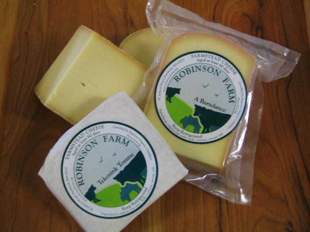 So, (although they aren’t shown here), there are a couple of part-time employees who do most of the packing. They also help with the affinage (turning and wiping the aging cheeses). The Robinson’s cheese is sold in specialty shops, their farm stand and in farmer’s markets. It may also be purchased from their website. When you buy an uncut wheel online, the price is only $10/ pound and the shipping is free with a purchase over $100. (This is a great deal!) Otherwise, it is $22.25 per pound with a 3 pound minimum. At the farm stand, the price for cut cheese is $15/pound and at the farmer’s markets, it’s $17/pound.