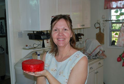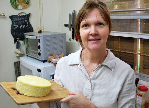 Sandra with a recent Caerphilly. It’s a little lopsided because she’s using a makeshift press.