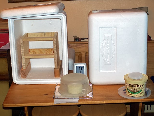 As an extra step… trays of ice cubes or warm water can be added to the cooler to get the initial temp started, and to cool down the inside, or even to tweak the temperature when opening to wash rinds, etc. My experience (aside from cheese) is that some of these coolers can hold a fairly stable temp, for days. I’ve thought about experimenting with one of the electric Heater/Cooler type units too, it would require a styrofoam cover over the air port, along with periodic monitoring…or an external thermostat…. Lots more experiments ahead!