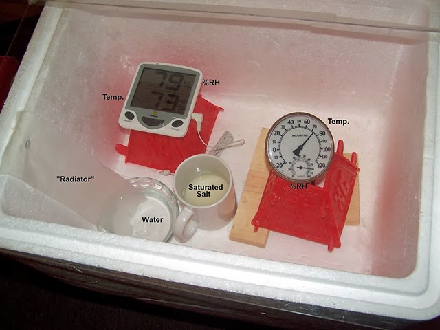 An 11 gallon cooler was also used, the salt solution was scaled up to ¼ cup salt with about a tablespoon of water and a corresponding sized cup of water. A stable 80% RH was maintained for 5 days at 71F.