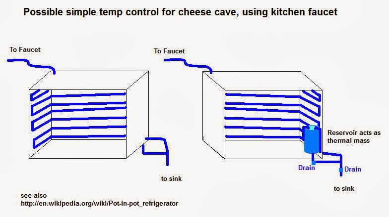 I’m sure any of these low tech designs would have to be evaluated in each circumstance used, of course. But, it should be able to be determined with relative ease for the specific application. Also, just using a styro-cooler with the cheese thrown in with a cool or warm thermal mass is less effective than, say, pre-warming/cooling the cave…so temperature interchange to the walls is minimized. Hence, running tubing around inside and making sure you run enough water to bring the walls into accord with the expected temp.