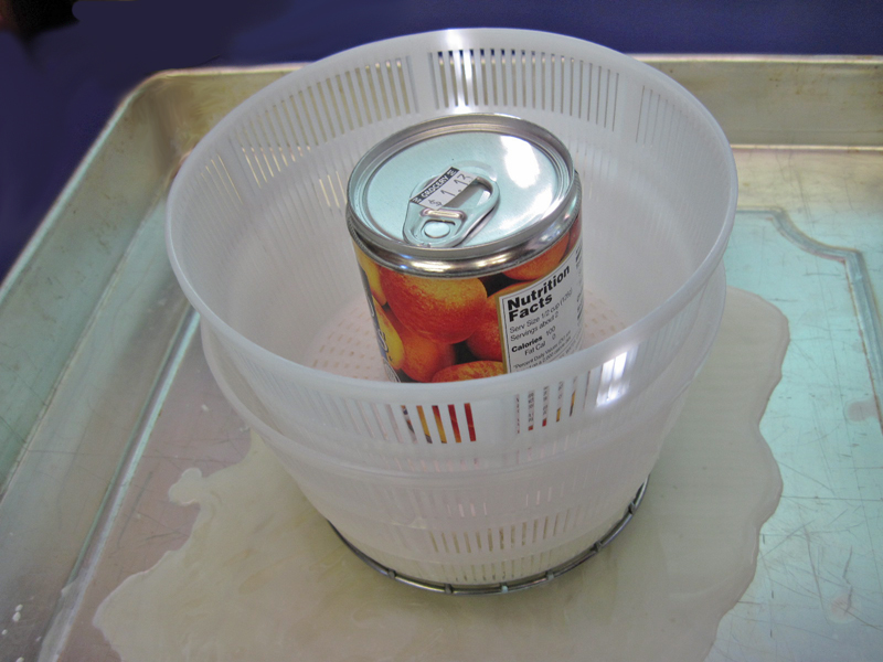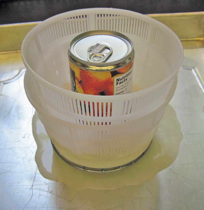 Remove the basket from the whey and set another mold inside of the first one and put an 6-8oz. glass of water on top of it. (this is used as a weight for pressing the cheese). Press this way for 2 hours.
