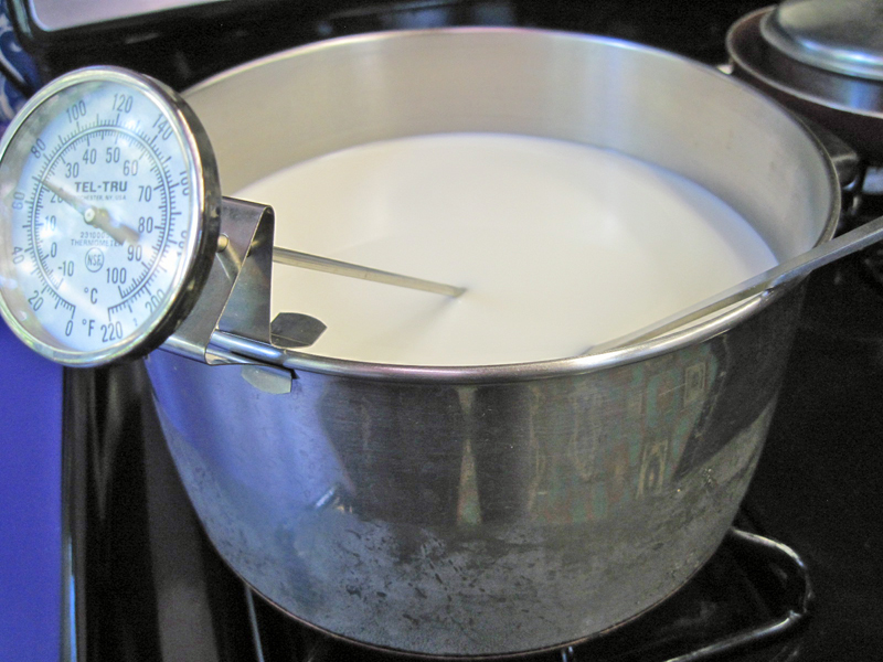 Heat the milk to lukewarm (86-90F) and add the rennet.