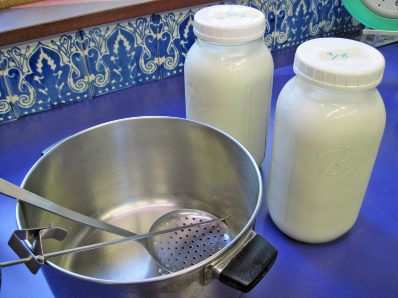 After the milk has set turn the heat back on to low and heat again for about 2 minutes. Using a slotted spoon pull the curds to the side of the pot. Keep moving the curds for about 10 minutes with the slotted spoon. (This breaks up the curd and keeps them drain in.)