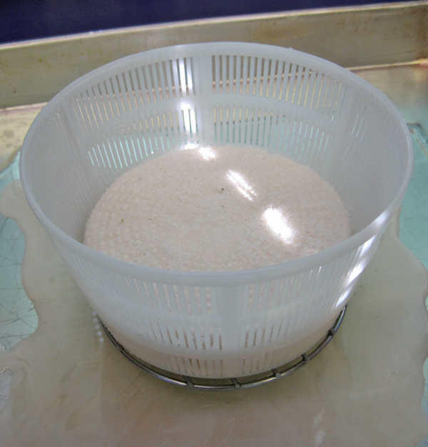 Take out the cheese and turn over, salt to taste, return to the basket and continue pressing for 1 and a half hours longer. (Note: I love salt, so I rolled the cheese in it, but most people would not want to do that. Even I had to brush off most of the salt later.)