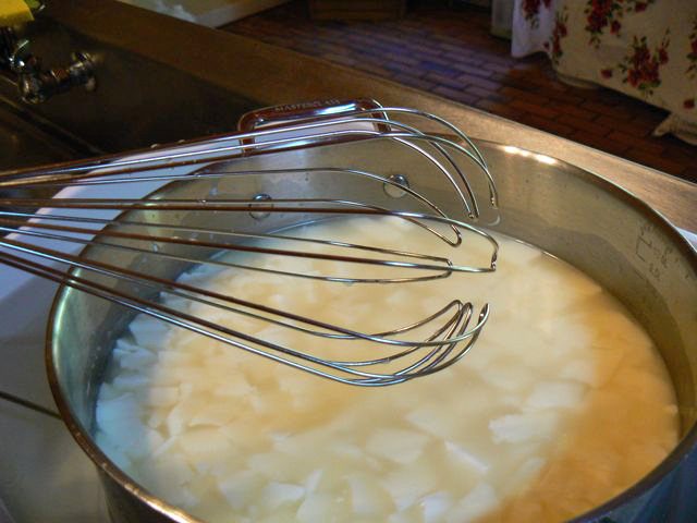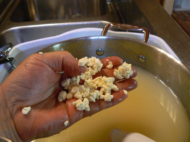 Cut the curds with a knife and then a modified whisk to 1/4″ size