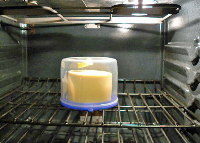 Let it set this way for 2 – 3 weeks while the “eyes” form, the cheese will swell and the shape changes