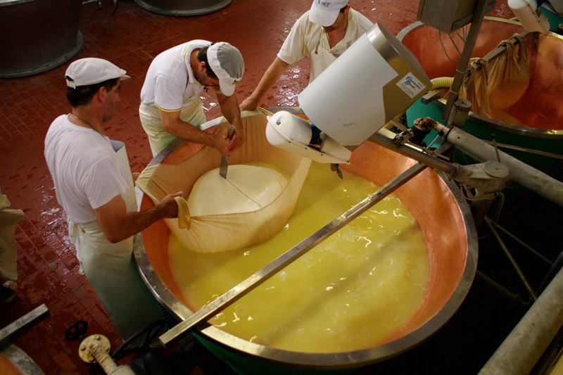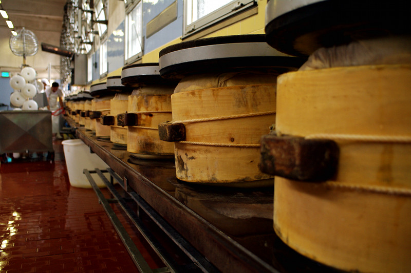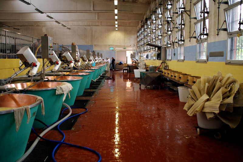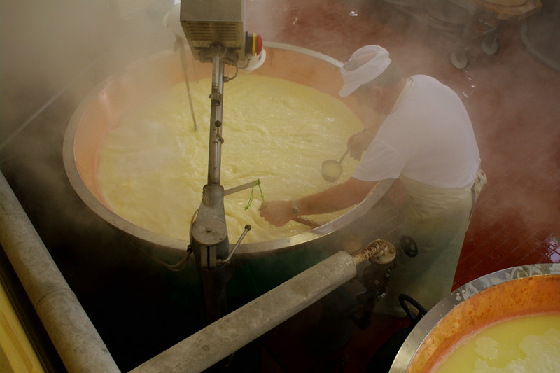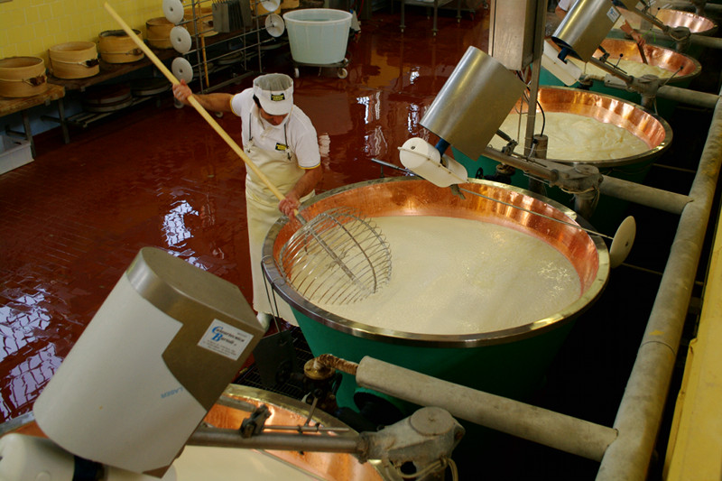 Milk arrives at the factory twice a day. The evening milk is left out overnight to allow the cream to rise to the surface. The cream is removed in the early morning to make butter (long-time readers might recall my previous post: The King of Butter), and then the “skimmed-milk” is combined with the morning’s whole, full-fat milk to make that day’s cheese: about 1,200 liters (317 gal) in each conical copper kettle.