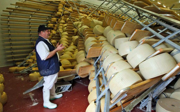 percent of the value of the real thing,” she said by telephone.She said 22,000 wheels of hard cheese fell over in their warehouse during the quake.”We still can’t see the floor in many places,” she said. “We will be lucky if we can somehow save half of it.”Production of milk used for cheese making in the area was also affected because many cows died in the collapse of stables or were left traumatized by the quake and its aftershocks, affecting the output and quality of milk.
