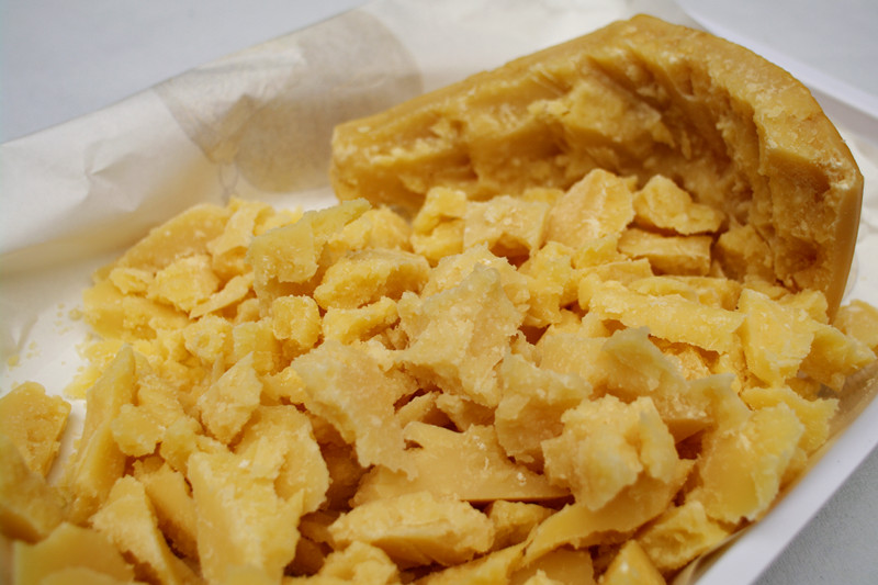 | Cutting the 90kg (198 lbs) mass of cheese curds into “twins” |
