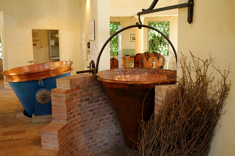 | A traditional copper kettle for making Parmesan cheese next to a modern one at the Museo del Parmigiano-Reggiano in Soragna |