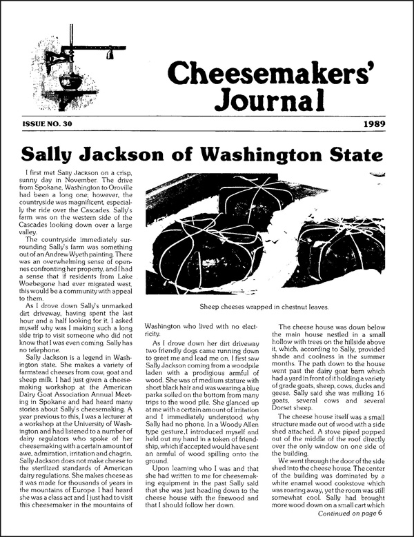 Twenty one years ago, we published an article about Sally in our Cheesemakers’ Journal (now called our Moosletter). Bob Carroll visited her farm and captured her personality and her lifestyle in Issue 30, 1989: