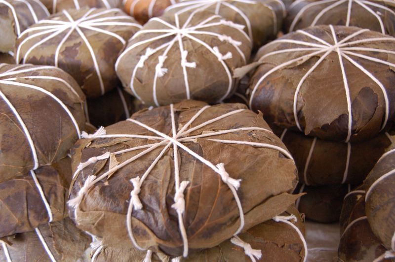 There are two windows in the cheese room providing light and a view overlooking the garden with a scarecrow and dairy barn in the distance. A shelf to one side of the stove houses spices and herbs which are added to some of the cheeses. These include dried tomatoes, garlic, dill, basil, black pepper, etc. Three sheep milk cheeses wrapped in chestnut leaves lay to the right of the spices. Sally explains that she has an elderly neighbor raising nut trees nearby who saves her chestnut leaves. “They are better than grape leaves which become bitter when dry. Chestnut leaves can be dried and then when soaked in water they will become soft again.” Next to the sheep cheeses sits a scale which is used to weigh the cheeses.