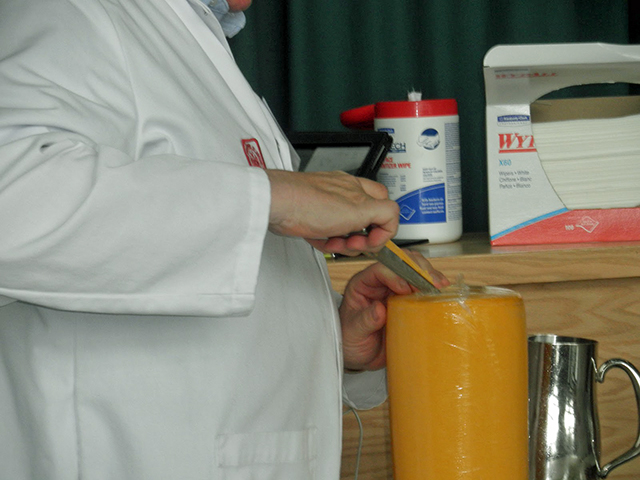 Next the judge looks at the cheese inside the plastic to see if there are any dents, discoloration or other defects. Then they take a sample of the cheese. If it is a hard cheese, they use the trier like in the photo below. The judge pulls out the cheese and then breaks off a hunk where the wax is and plugs it back in the hole.